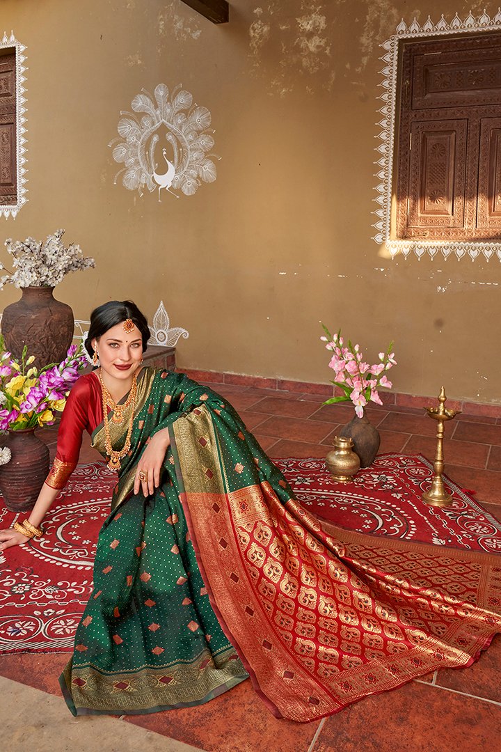 Banarasi sarees are woven using a special weaving technique that involves intertwining silk or zari (metallic thread) into the fabric to create intricate patterns. The zari work is a defining characteristic of Banarasi sarees and adds a touch of grandeur.