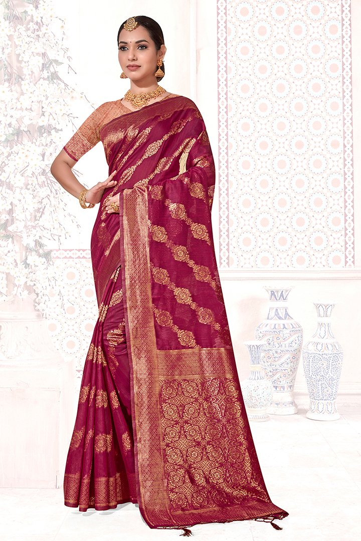 Beautiful Mahroon Chanderi Cotton Saree With Matching Blouse And All Over Flower Print Design