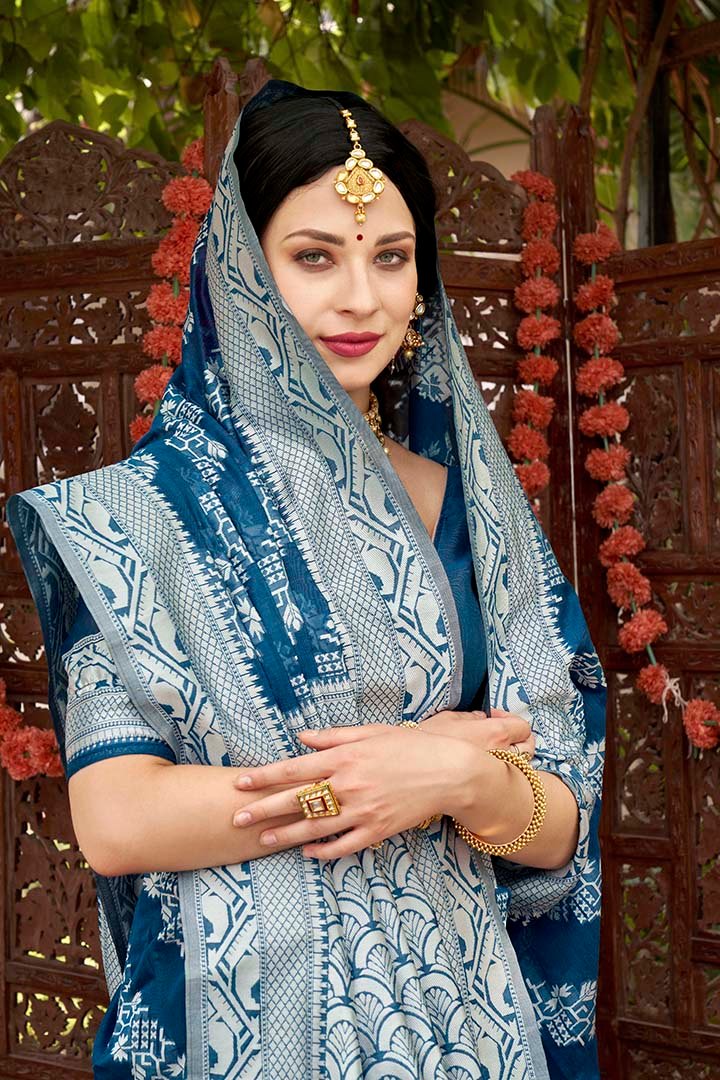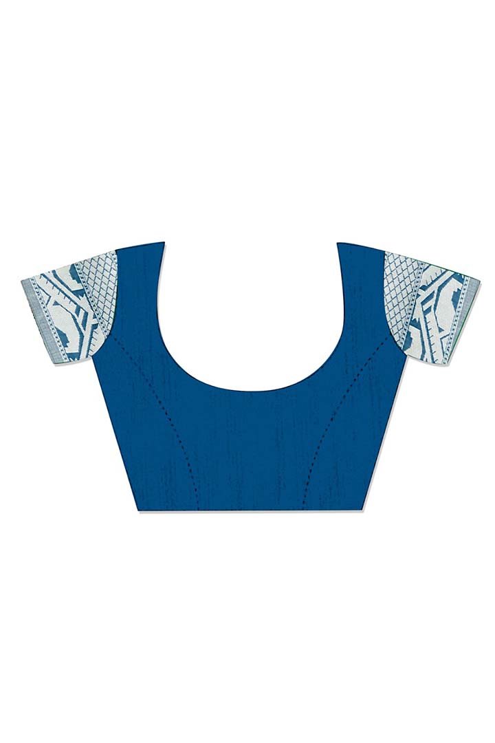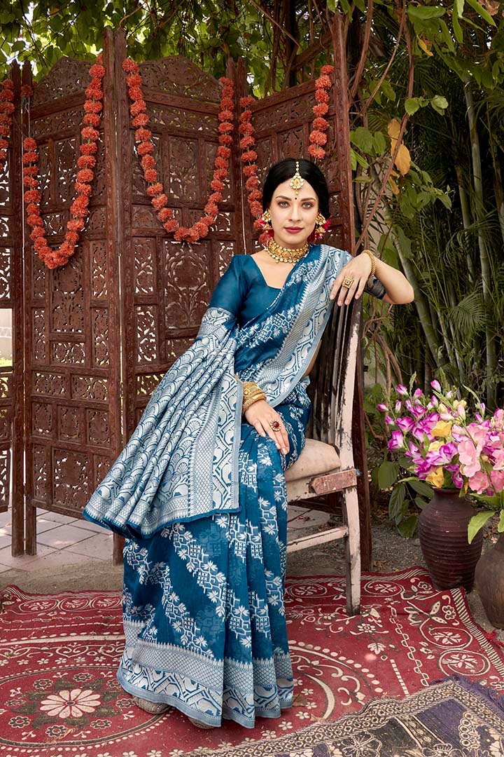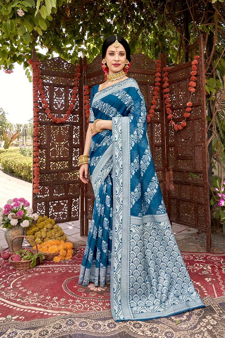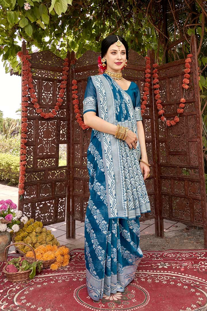 Beautiful Teal Blue Chanderi Cotton Saree With Matching Blouse And All Over Flower Print Design