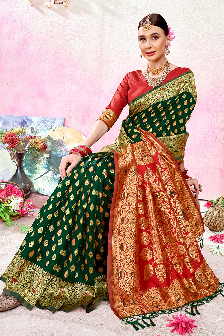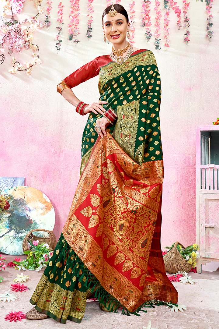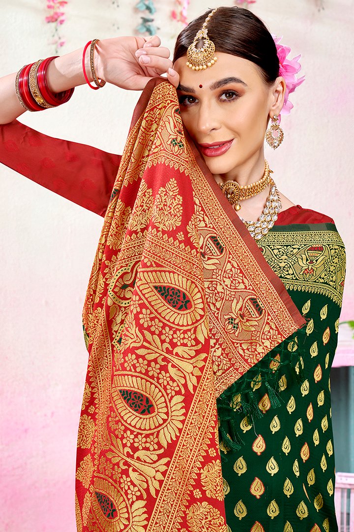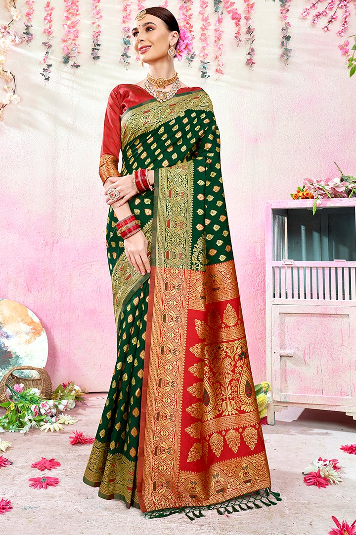 Beautiful Green Banarasi Art Silk Saree With Matching Unstitched Blouse And Dimond Design Work On Pallu.