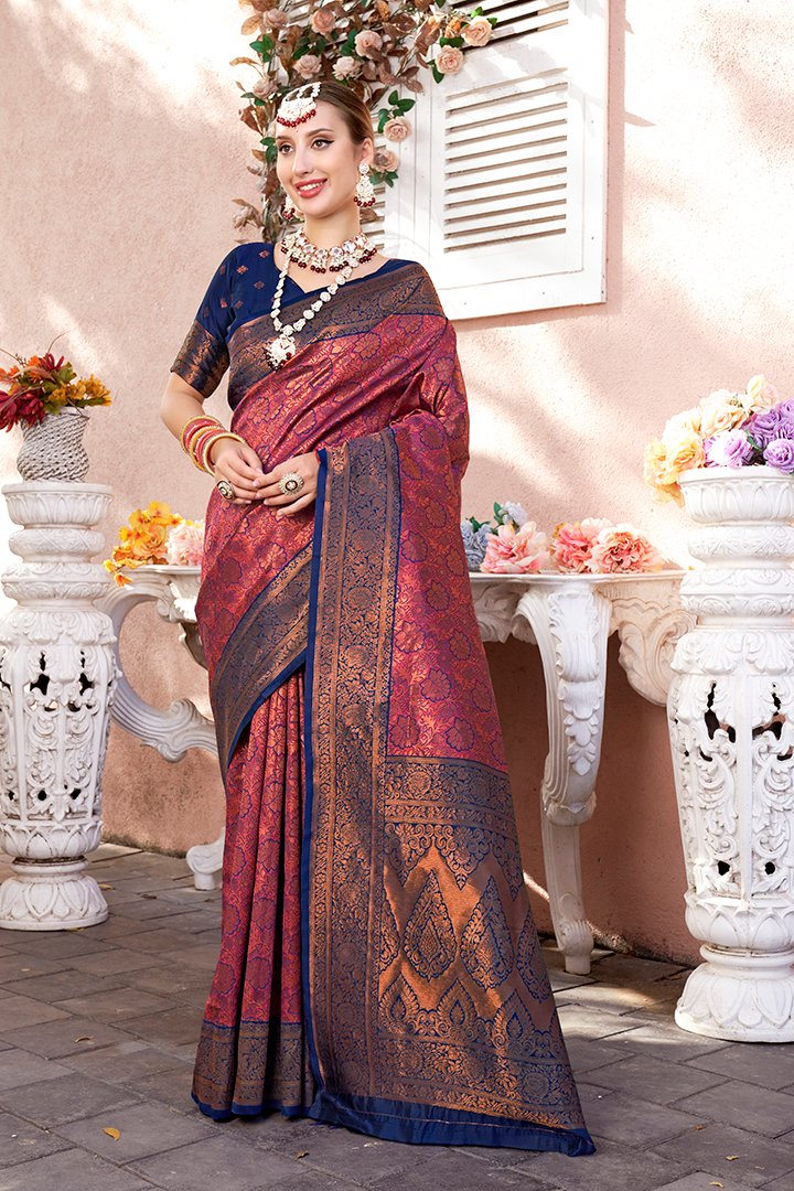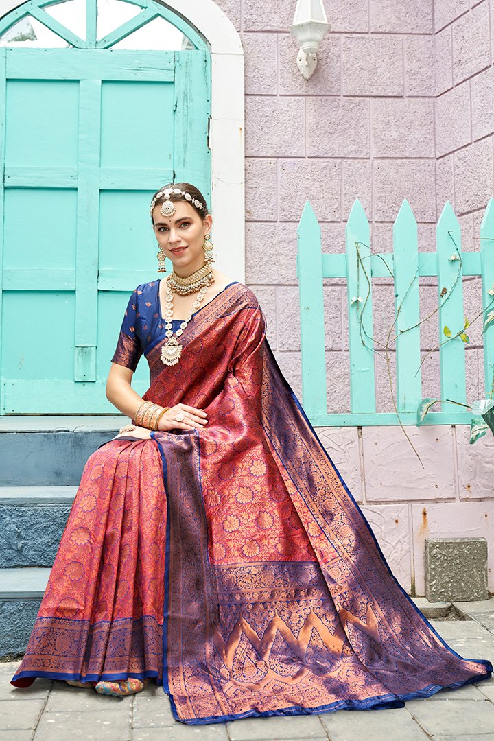 A Kanjivaram saree, also known as Kanchipuram saree, is a luxurious and exquisite traditional Indian garment that originates from the town of Kanchipuram in the state of Tamil Nadu, India. Renowned for its opulent silk fabric, vibrant colors, and intricate zari work, the Kanjivaram saree is considered one of the most prized possessions in a South Indian woman’s wardrobe.
